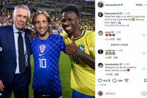体育资讯4月2日讯 克罗地亚在友谊赛中1-3不敌巴西,莫德里奇社媒晒出与安切洛蒂、前队友的合照。