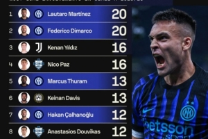 1、劳塔罗(国米)20次