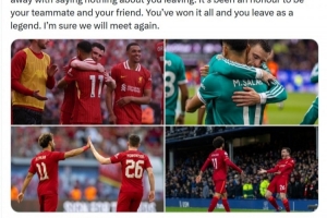 萨拉赫社媒晒出与罗伯逊的合照,配文:“看着这些记录我们深厚情谊的照片,我甚至觉得即便对你的离队只字不提也无妨。能成为你的队友和朋友,是我的荣幸。你已赢得一切,并以传奇之姿离去。我相信我们定会再次相逢。”