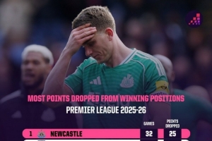 体育资讯4月15日讯 数据机构OPTA统计了本赛季英超在领先情况下最终丢分情况,纽卡斯尔25分最多。