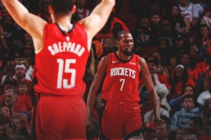 赛后火箭官方发布赢球海报,杜兰特和谢泼德(背影)成为封面人物。